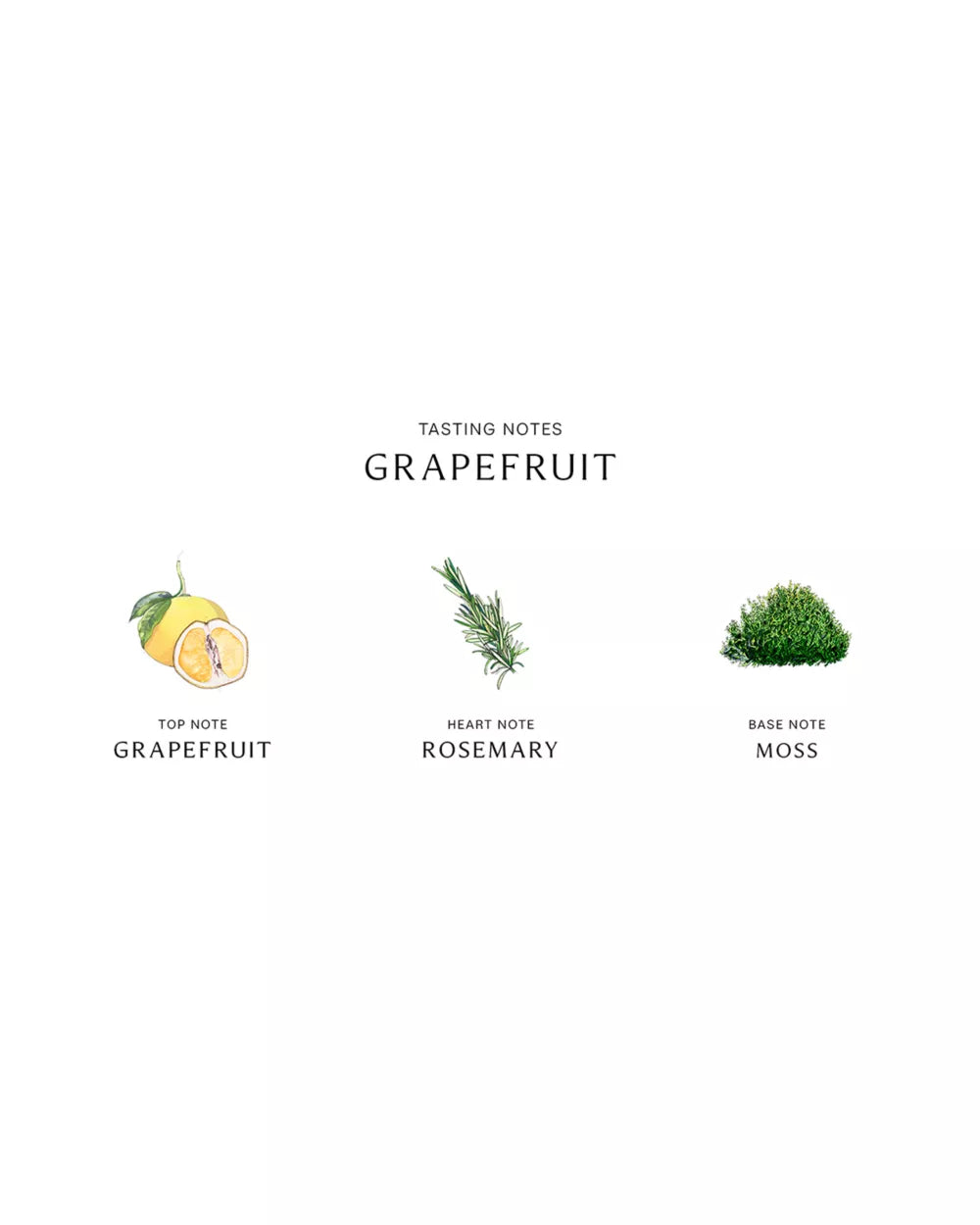 - Top note: grapefruit- Middle note: rosemary- Base note: moss