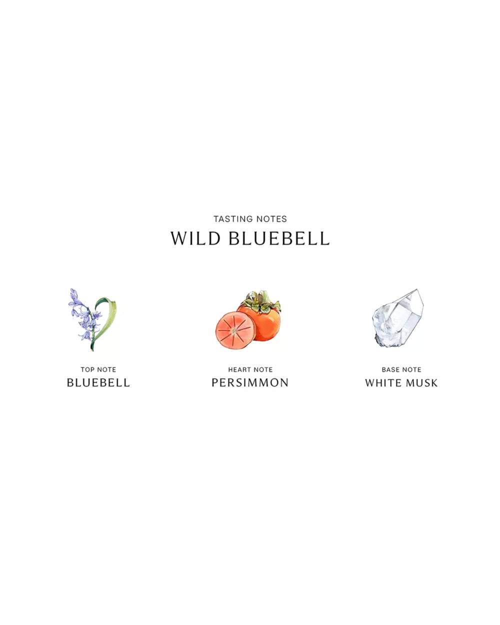 Vibrant sapphire blooms in a shaded woodland. The delicate sweetness of dewy bluebells suffused with lily of the valley and eglantine, and a luscious twist of persimmon. Top note: BluebellA wildflower accord, blended with notes of crisp, green leaves, the balsamic sweetness of spicy clove buds and a subtle dewy accent. Middle note: PersimmonA milky-peach note with clean, creamy undertones. Base note: White MuskPowdery and clean, it enhances the trail of the scent, adding a softness that endures.